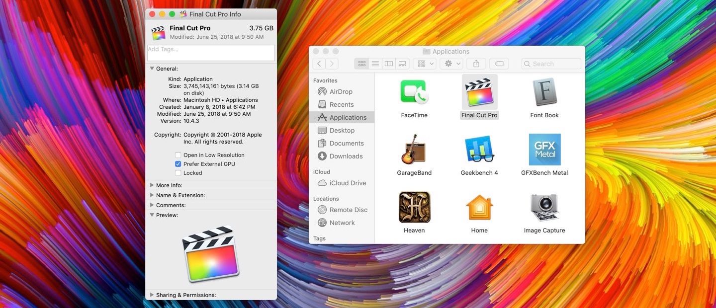 Pokud patříte mezi majitele počítačů s nainstalovým macOS Mojave beta 5, můžete si zmíněnou funkci vyzkoušet zvolením příslušné aplikace ve Finderu. Na ikonku aplikace klikněte pravým tlačítkem a zvolte Informace, v okně s informacemi o příslušné aplikaci pak zaškrtnete možnost upřednostnění externí grafiky. Příslušná externí karta musí být při nastavování pochopitelně připojená k vašemu počítači, externí GPU je možné připojit k jakémukoliv Macu, který disponuje Thunderbolt 3 portem.