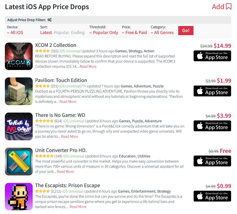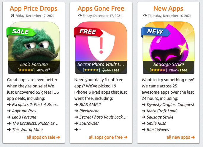 Web 148Apps vám poskytne výpis slev podle zařízení a podle toho, zda je aplikace či hra zdarma. To je ale prakticky vše. Ukazuje alespoň, kdy byla sleva uveřejněna a podle toho si můžete udělat obrázek, jak dlouho bude ještě sleva trvat. Vyjma výčtu slev se pak jedná o informační magazín o aplikacích a hrách, na které také přináší recenze.