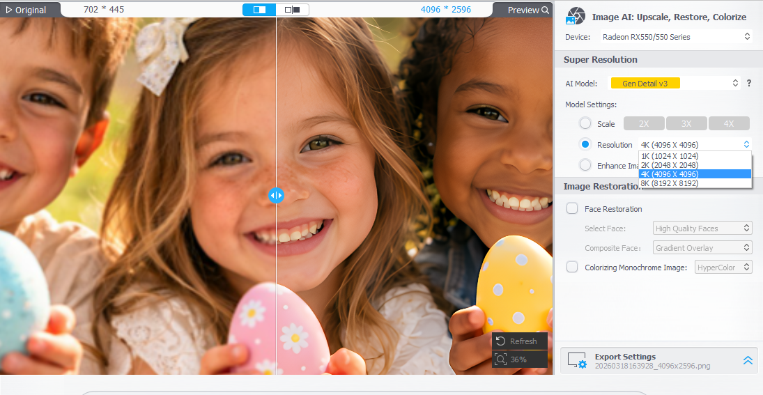 Zachytit vzpomínky na iPhonu nebo iPadu je snadné, ale sledovat, jak na Macu ztrácejí ostrost, může být frustrující. Funkce Image AI v aplikaci VideoProc tuto mezeru překlenuje. Rodinné portréty, cestovní snímky nebo skupinové fotografie lze upscalovat na rozlišení 4K, 8K nebo 10K s přirozenými detaily. Funkce Face Restoration zaostří vlasy, oči a pleť, čímž oživí staré nebo nedokonalé snímky, zatímco černobílé fotografie získají realistické barvy. Inteligentní odšumování a odstranění rozmazání zajistí, že každý obrázek na zařízeních Apple, od snímků pořízených iPhonem až po úpravy na Macu, bude vypadat dokonale.