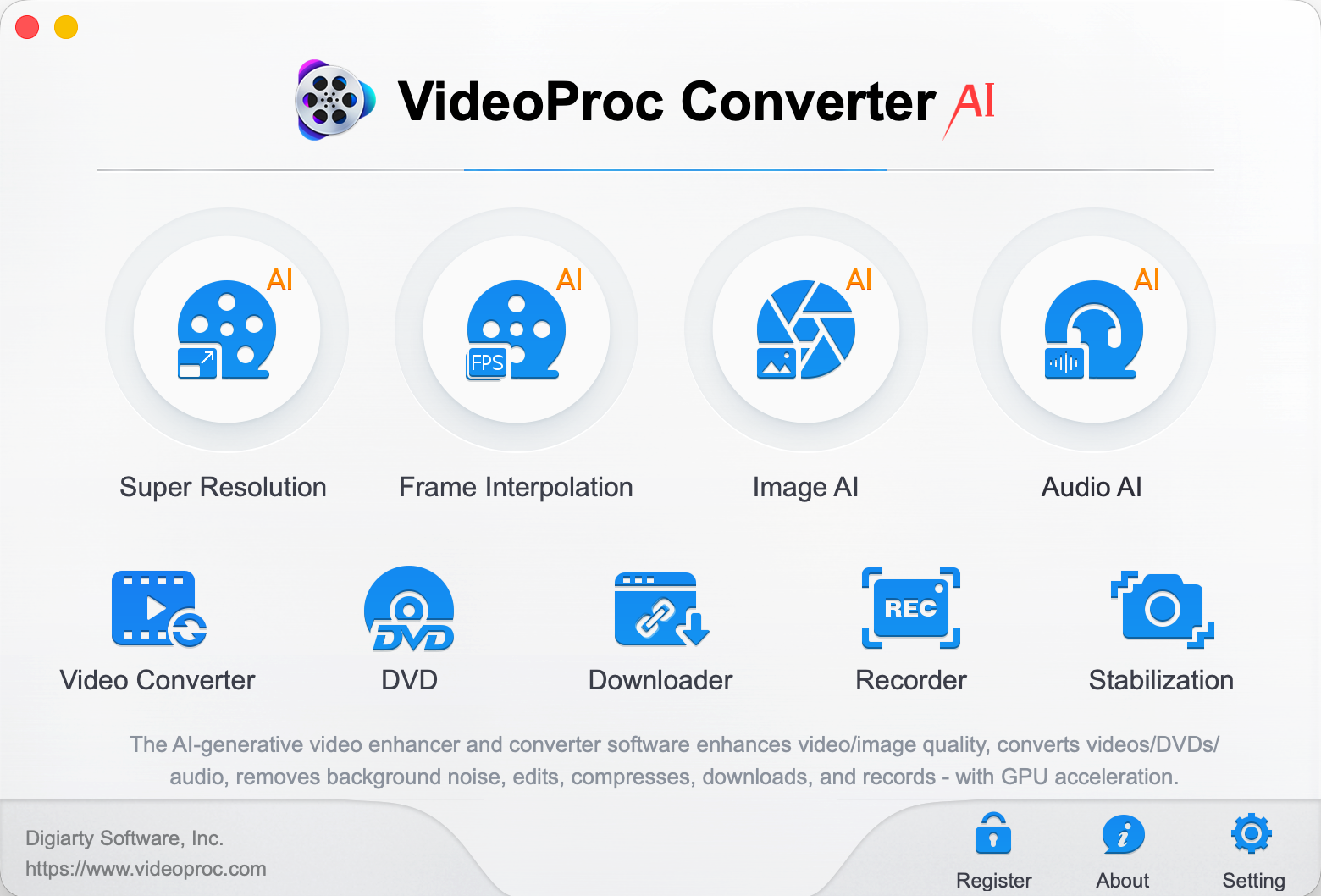 Právě zde přichází na řadu VideoProc Converter AI. Tento program, navržený jako komplexní řešení pro práci s multimédii s integrovaným nástrojem pro vylepšení videa a obrázků pomocí umělé inteligence, se do tohoto pracovního postupu Apple perfektně hodí. Umí odstranit šum, rozostření a převzorkovat záběry na rozlišení 4K s přirozenými detaily, zatímco modul Image AI se stará o převzorkování, restaurování a kolorizaci fotografií. Tento nástroj také pokrývá každodenní úkoly, jako je konverze formátů, komprese, úpravy a stahování, a to vše v jediném efektivním pracovním prostředí.