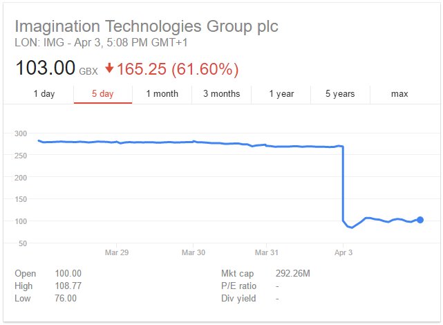 Pokud jste dodavatelem klíčové součástky pro iPhony, kterých se čtvrtletně prodá desítky milionů, můžete si být jisti, že se vám bude dařit. Jakmile ale o vás Apple přestane mít zájem, máte problém. Výrobce grafických čipů Imagination Technologies stála přesně taková zkušenost zhruba půl miliardy dolarů. O tolik po strmém propadu akcií klesla hodnota firmy.