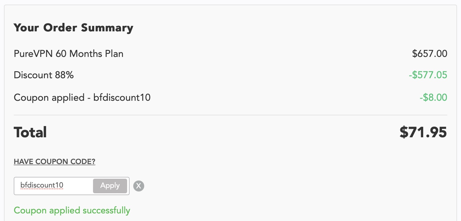 O pár odstavců výše jsem nakousl speciální akci Black Friday, díky které můžete PureVPN získat s více než 88% slevou. Konkrétně se tato sleva vztahuje na pětileté předplatné, které klasicky bez slevy vychází na 657 dolarů. Po 88% slevě, kterou nabízí samotné PureVPN, se rázem dostanete na pouhých 79.95 dolarů, což udává slevu celých 577.05 dolarů. A pokud využijete ještě náš 10% slevový kód (viz níže), tak na dva roky získáte PureVPN za pouhých 71.95 dolarů (1.20 dolarů měsíčně), což vychází v přepočtu na zhruba 1635 korun (27 korun měsíčně). K dispozici jsou pak ještě také další předplatná, která už však nejsou tak výhodná jako to dvouleté. Pokud byste chtěli využít tříměsíční předplatné, tak to vás po 39% slevě vyjde na celkově 19.95 dolarů (6.65 dolarů měsíčně), roční předplatné pak vychází na celkově 35.88 dolarů (2.99 dolarů měsíčně). Jedná se o nabídku, která se opakuje pouze jednou ročně a rozhodně byste ji neměli propásnout!