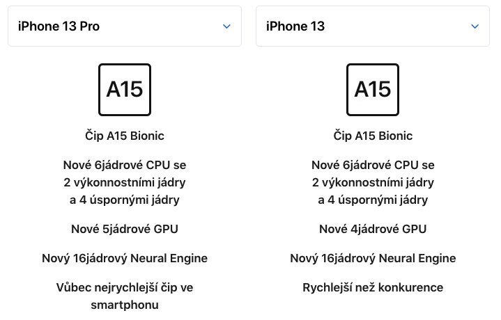 Apple představil iPhone 13 a iPhone 13 Pro, a přestože mají oba stejný čip, ve výkonu se mírně liší. Ve skutečnosti je totiž GPU čipu A15 Bionic, který se nachází v modelech iPhone 13 Pro, výkonnější, než ten v nižších modelech iPhone 13. Ať už sáhnete po jakémkoli modelu z portfolia iPhone 13, bude osazen právě čipem A15 Bionic. Apple o něm říká, že tento nový čip má dvě vysoce výkonná jádra a čtyři úsporná. Mezi „běžnými“ a „profesionálními“ modely je však rozdíl. Modely Pro totiž mají nové 5jádrové GPU, kdežto modely bez tohoto přídomku jsou osazeny jen 4jádrovým GPU. Také z toho důvodu Apple u vyšší rady uvádí poznámku „vůbec nejrychlejší čip ve smartphonu“, u nižší řady má jen poznámku „rychlejší než konkurence“.