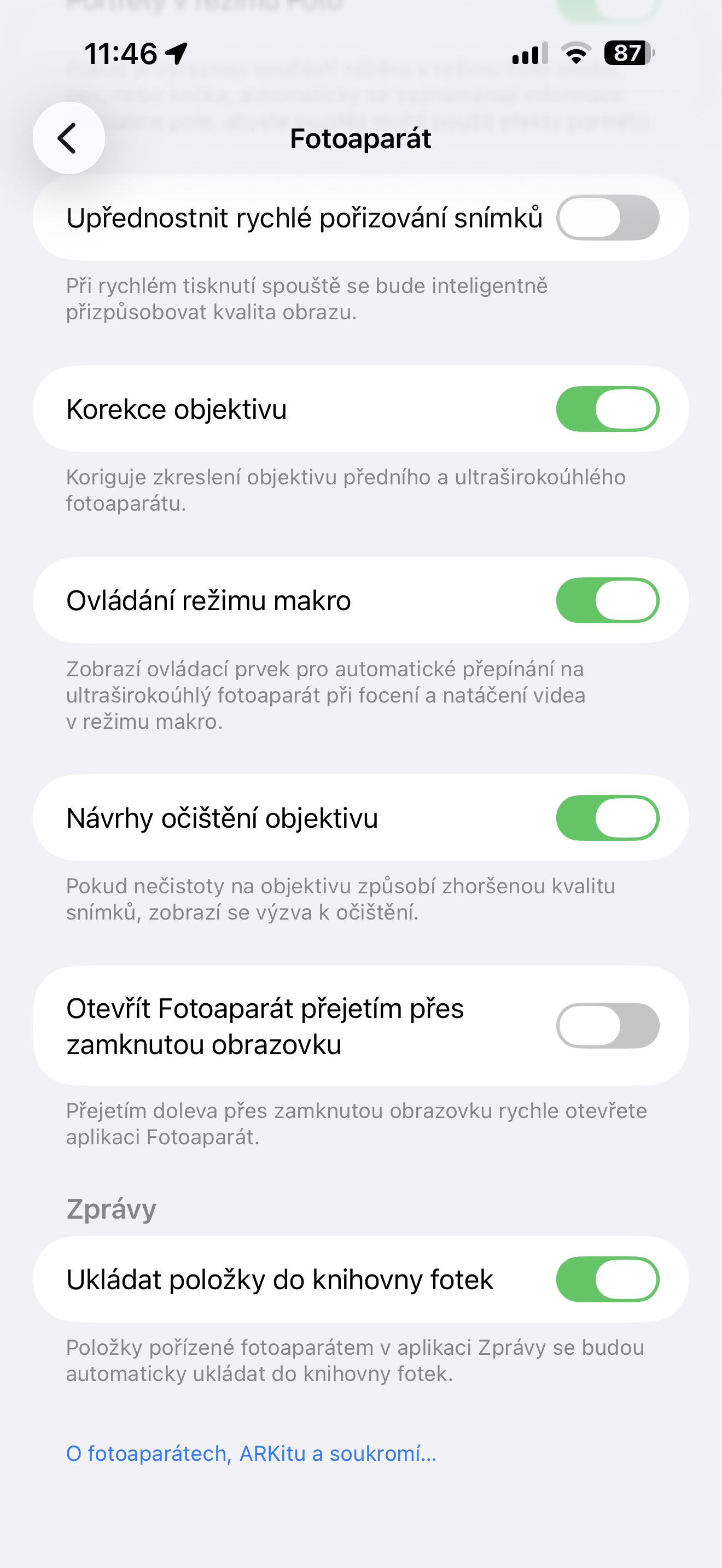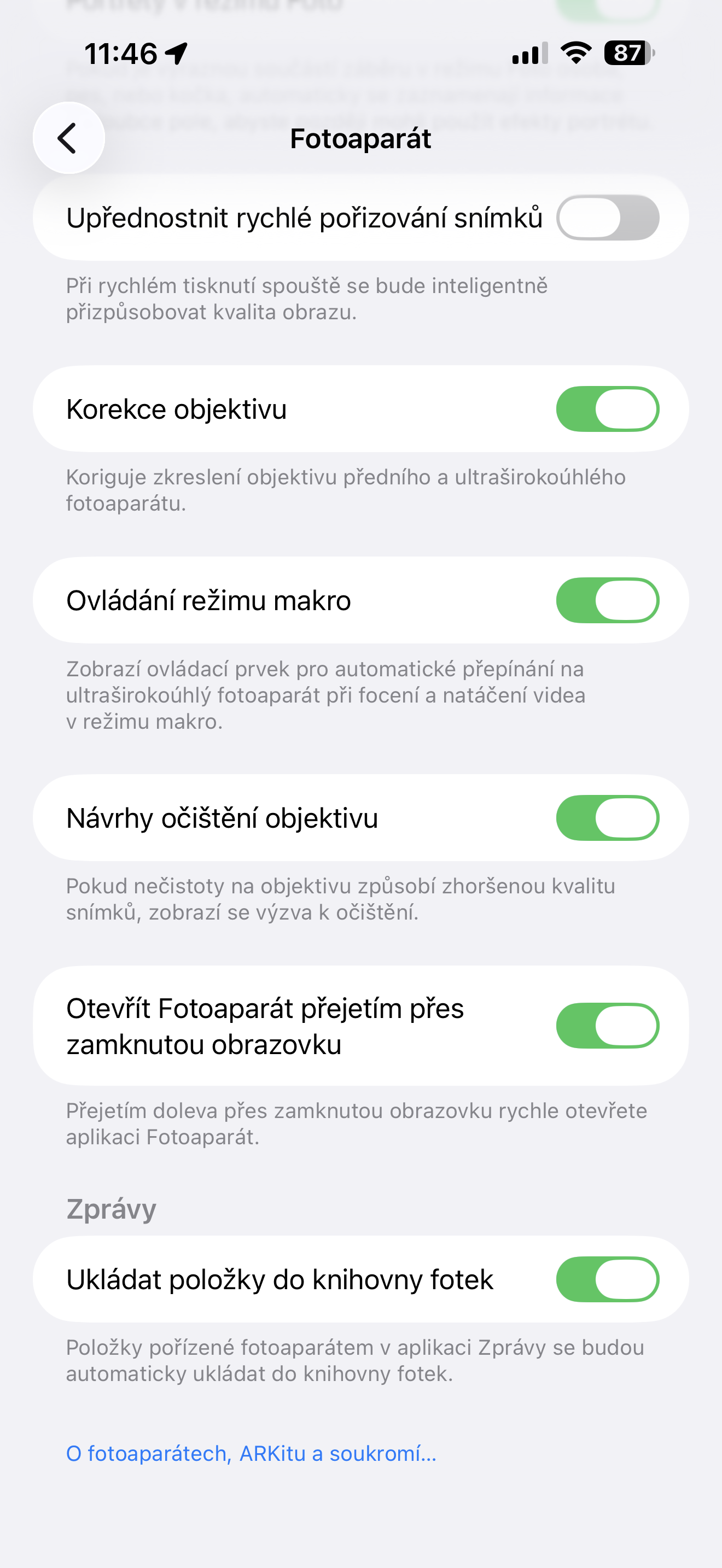 Co naopak ocením, protože se mi to stává častěji, než bych si přál, je deaktivování gesta přejetím z pravé strany zamčené obrazovky směrem doleva, čímž spustíte Fotoaparát. Je tomu i proto, že s Ovladačem fotoaparátu toto gesto opravdu nepotřebuji. Volbu najdete v Nastavení -> Fotoaparát -> Otevřít Fotoaparát přejetím přes zamknutou obrazovku.