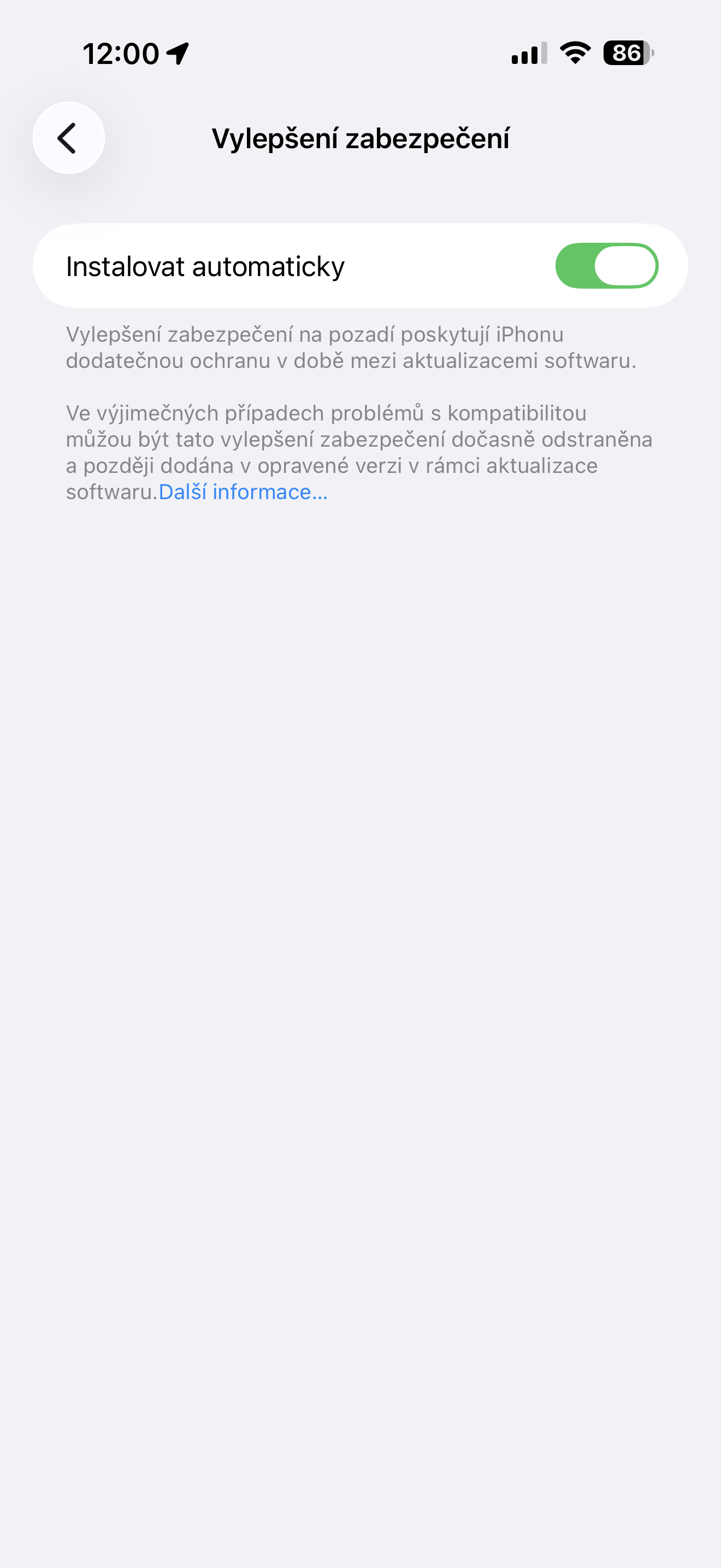 I když Apple vydal tzv. Rapid Security Responses, tedy rychlou aktualizaci zabezpečení, museli jste si ji stáhnout a nainstalovat v Nastavení jako jinou aktualizaci (pokud jste neměli aktivované automatické aktualizace). Stalo se tak tedy zatím jen jednou, a to v červenci roku 2023. V iOS 26.1 jde ale nastavit, aby se tyto aktualizace instalovaly automaticky bez nutnosti vaší interakce. Tuto funkce jde vypnout/zapnout v Nastavení -> Soukromí a zabezpečení -> Vylepšování zabezpečení na pozadí.