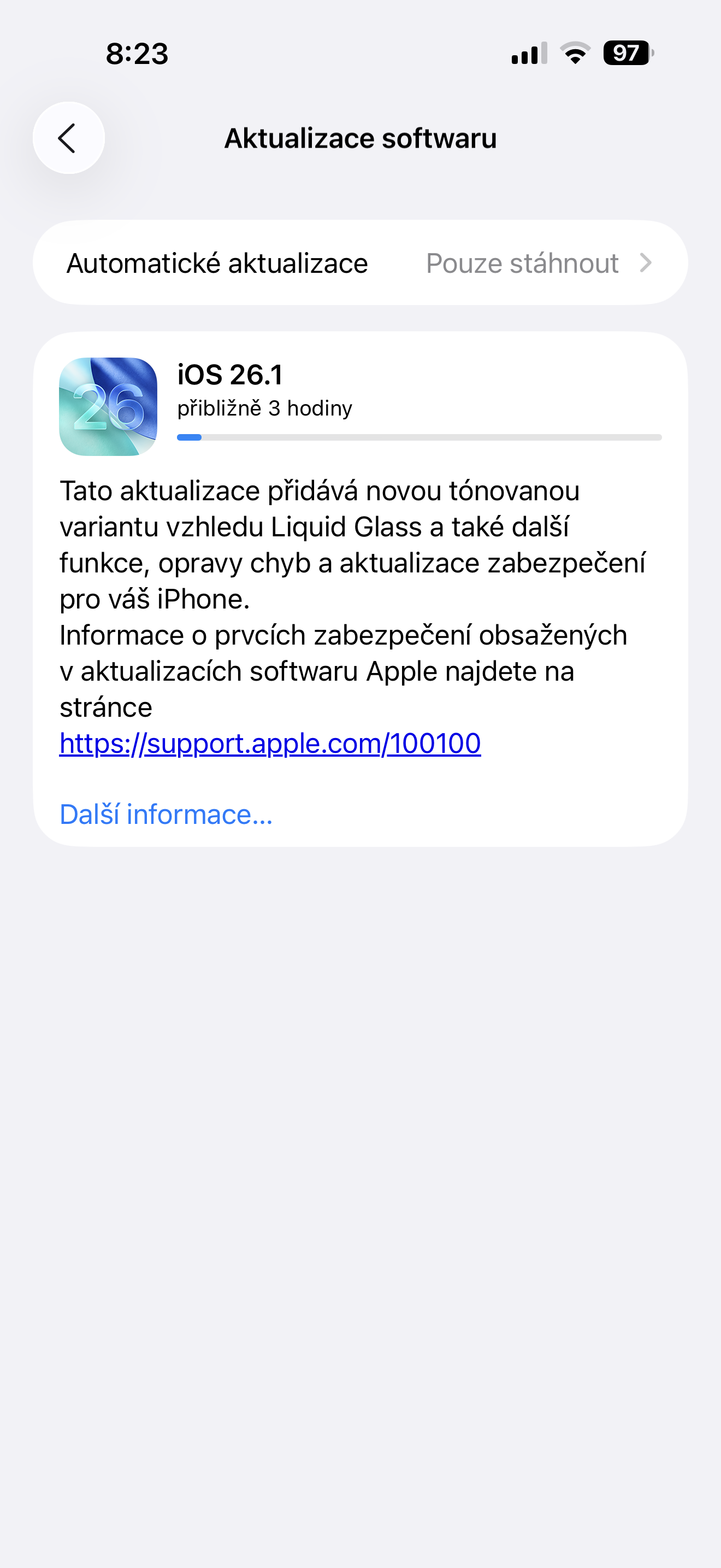 Byl to ale boj. I dnes ráno trvalo aktualizování iPhonu 17 Pro Max více jen jednu hodinu. Nezvykle dlouho trvala samotná autorizace, pak se samozřejmě muselo čekat, než se ze serverů Applu stáhne ten neskutečně obří balík dat, který měl velikost 11,17 GB. Je otázkou, proč tomu tak je, když těch nových funkcí nese iOS 16.1 vlastně jen hrstku.
