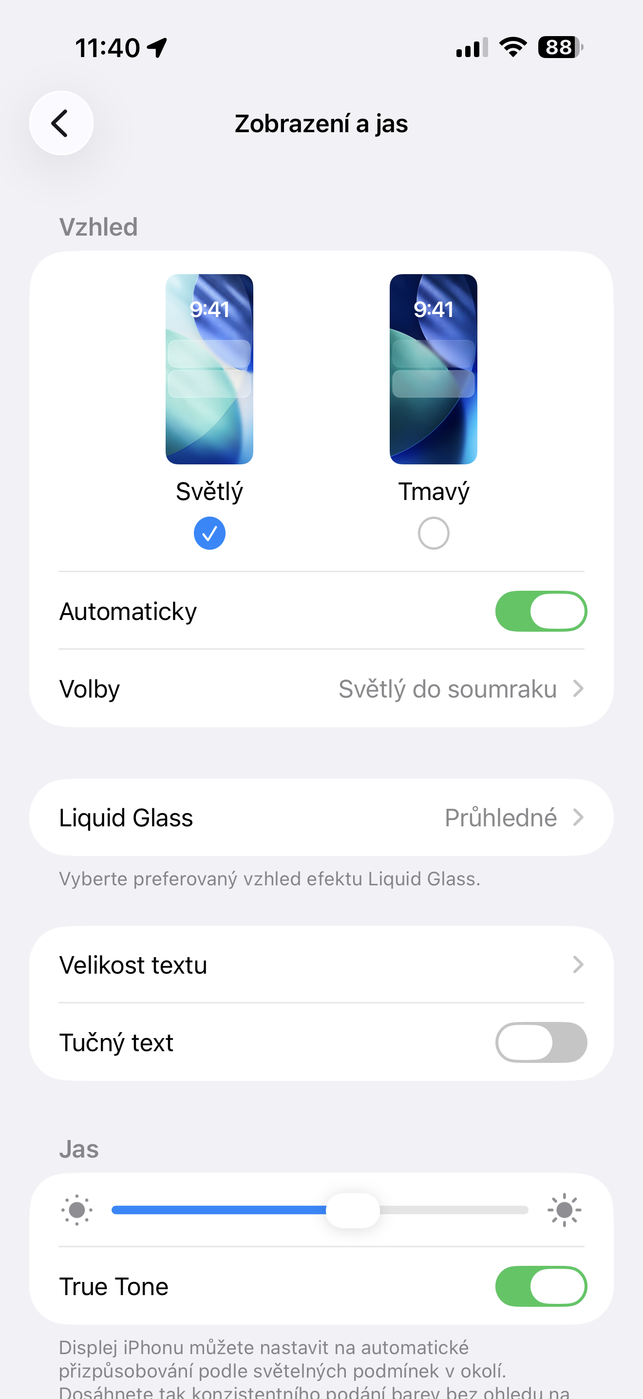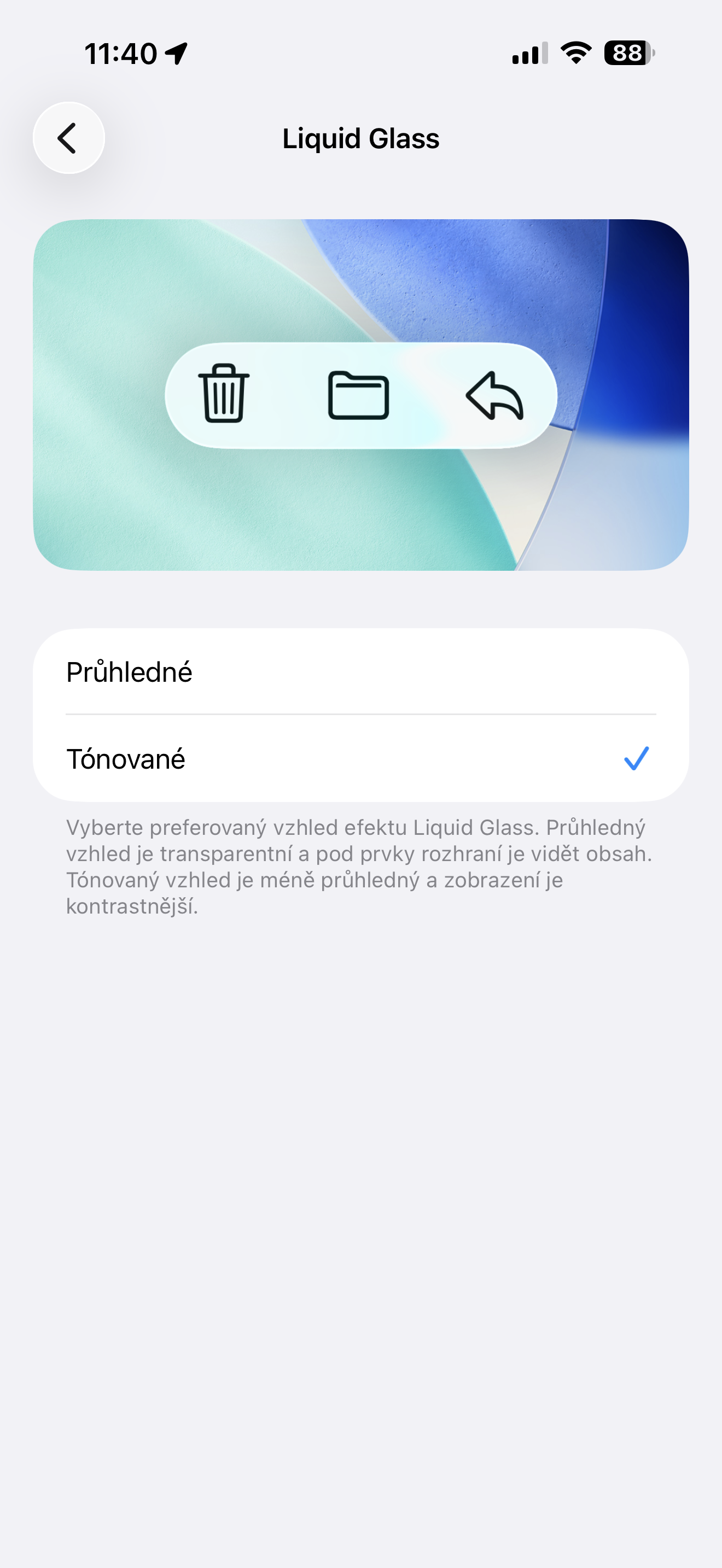 Pro někoho spása, pro někoho zbytečnost. Osobně patřím do té druhé skupiny, protože Liquid Glass design se mi stále líbí a nechci ho nijak tlumit. Nicméně pro ty, kterým přijde nepřehledný, je tu nová možnost. Stačí zavítat do Nastavení -> Zobrazení a jas -> Liquid Glass, kde se můžete přepnout z volby Průhledné na Tónované. Žádný mezistupeň tu není a tato volba se propíše na všechny nabídky v systému.