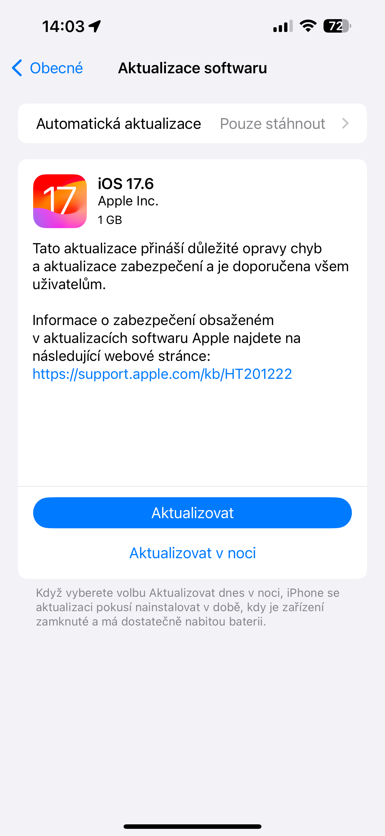 Novinky připravené pro iOS 17 už Apple vystřílel a verze iOS 17.6 by jistě snesla menší setinové označení, protože prakticky nepřináší nic nového. Její popisek totiž zní jen: „Tato aktualizace přináší důležité opravy chyb a aktualizace zabezpečení a je doporučena všem uživatelům.“ I tak je ale její velikost skutečně obrovská, protože budete muset ze serveru Applu stáhnout cca 1 GB dat.