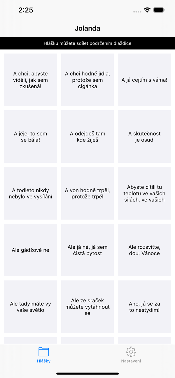 Asi jen těžko někdo nebude znát legendární českou věštkyni Jolandu, a to zejména pro její výroky, které za svoji kariéru pronesla. Aplikace Jolanda umí v podstatě jen jednu věc, a to přehrávání těchto výroků. Obsah můžete snadno sdílet prostřednictvím jakéhokoli komunikačního kanálu, své přátele tedy neochudíte o nic, co by vás zaujalo.