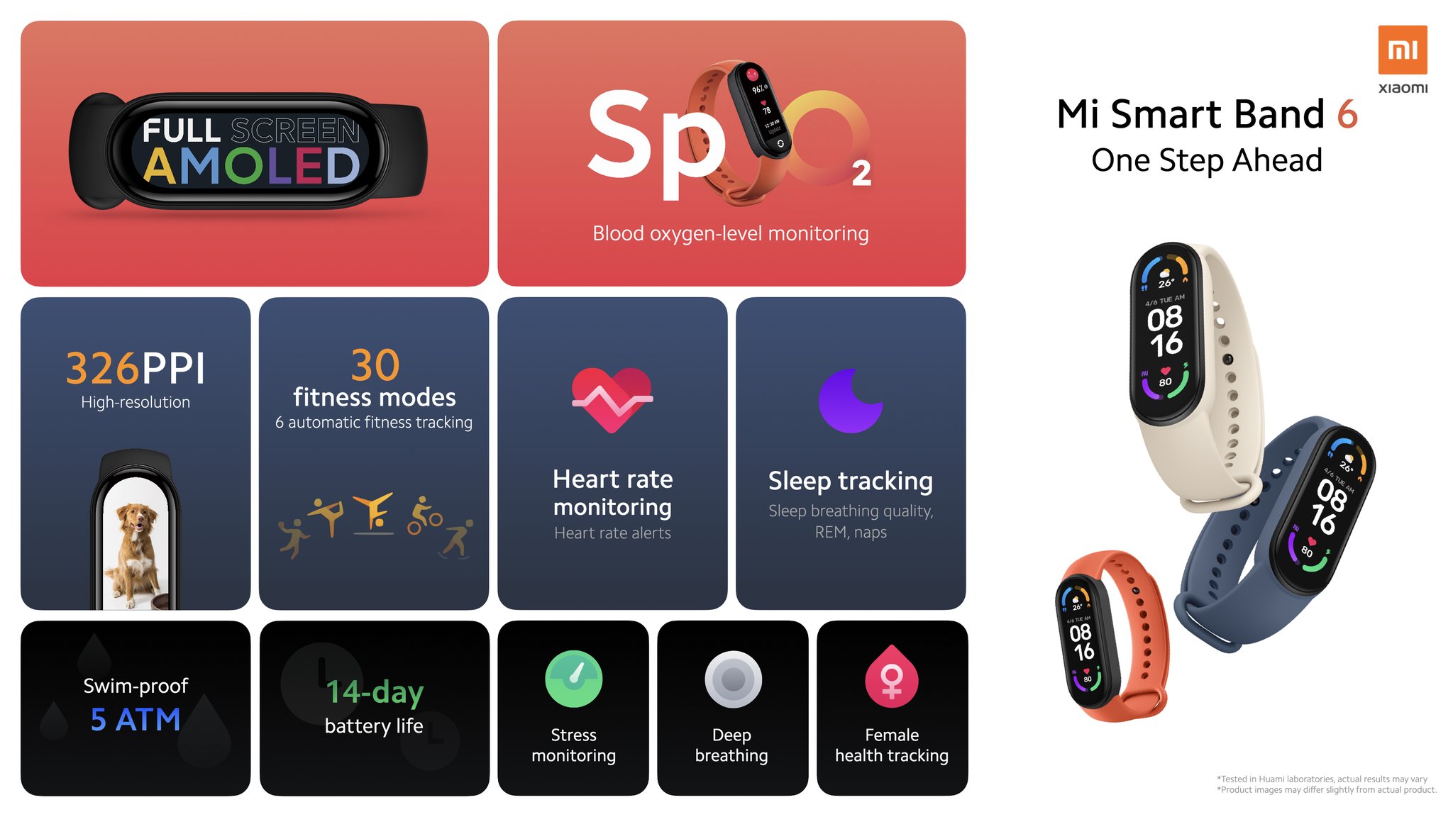 Xiaomi Mi Smart Band 6 má úhlopříčku svého AMOLED displeje 1,56“, jeho rozlišení je 486 × 152 bodů při 326 pixelů na palec s maximálním jasem až 450 nitů. Navíc je krytý temperovaným sklem, které by mělo vydržet i hrubší zacházení. Náramek umí rozpoznat šest aktivit, přičemž dalších 30 si můžete zapnout ručně. Patří mezi ně i tanec nebo box. I když nedisponuje GPS, pořád nabízí měření srdeční frekvence a nově i okysličení krve SpO2.