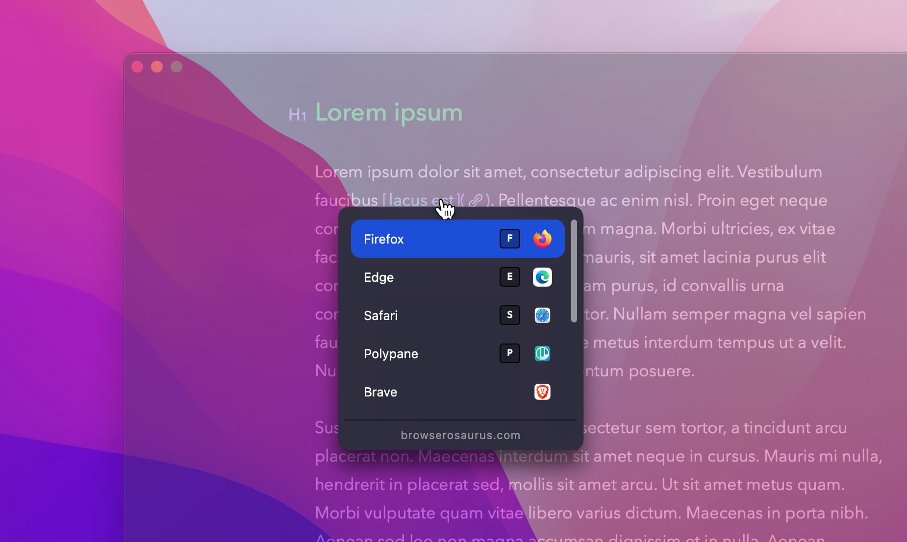 Browserosaurus je open-source aplikace pro macOS, která slouží jako chytrý prostředník při otevírání odkazů. Po nastavení jako výchozí prohlížeč zachytává odkazy kliknuté v jiných než prohlížečových aplikacích a zobrazí přehledné menu s výběrem všech nainstalovaných prohlížečů. Uživatel si tak může při každém kliknutí zvolit, ve kterém prohlížeči chce daný odkaz otevřít. Browserosaurus je ideální pro ty, kteří pracují s více prohlížeči a chtějí mít nad otevíráním odkazů plnou kontrolu.