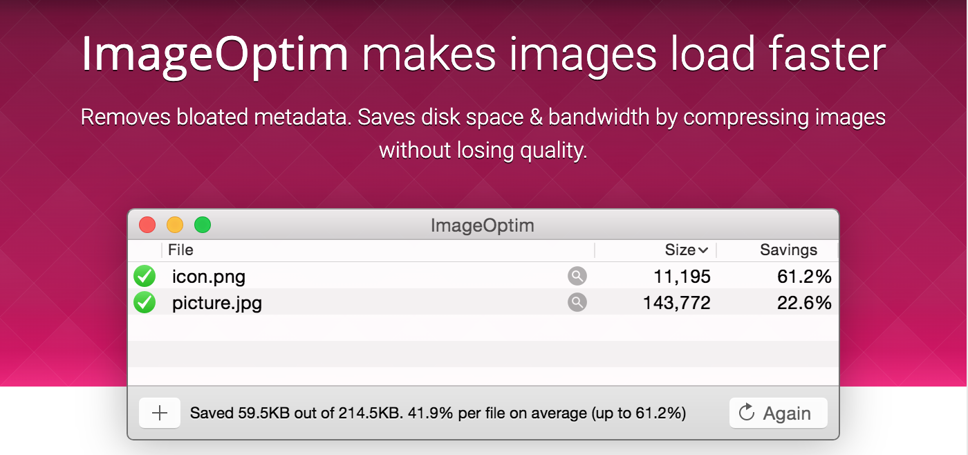 ImageOptim je aplikace, sloužící k efektivní změně velikosti vašich fotografií a dalších obrazových souborů. Díky svým funkcím vám ImageOptim pomůže ušetřit místo na disku vašeho Macu. Nabízí celou řadu funkcí, jako je odstranění EXIF dat, nepotřebných barevných profilů a spoustu dalšího.