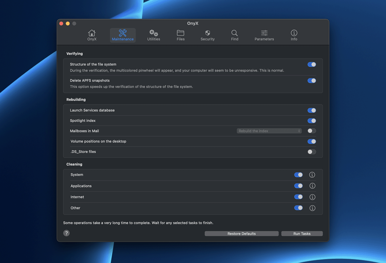 OnyX je multifunkční nástroj, který můžete použít k ověření struktury systémových souborů, k provádění různých údržbových a čisticích úloh, ke konfiguraci parametrů ve Finderu, Docku, Safari a některých nativních aplikacích, k promazání mezipaměti, k odstranění některých problematických složek a souborů, k obnově různých databází a indexů a k dalším činnostem. OnyX je spolehlivá aplikace, která poskytuje přehledné rozhraní pro mnoho úloh, které by jinak vyžadovaly zadávání složitých příkazů pomocí rozhraní příkazového řádku.