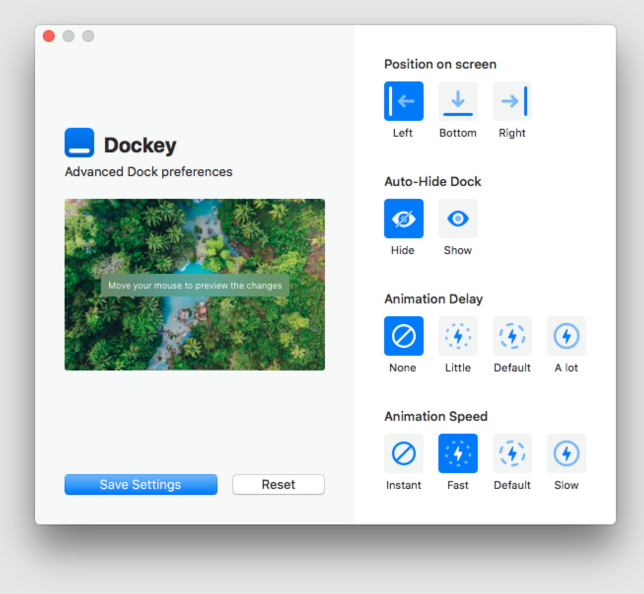 Víte, že funkce Docku můžete přizpůsobit pomocí příkazů Terminálu? Aplikace Dockey pro macOS přináší všechny tyto funkce v jednoduchém uživatelském rozhraní. Dockey není typická aplikace nahrazující Dock. Umožňuje pouze provádět změny pomocí několika kliknutí. Můžete například změnit polohu a styl animace Docku. Pokud jde o pokročilé předvolby Docku, Dockey si s tím poradí – můžete například nastavit i zpoždění a rychlost animace.