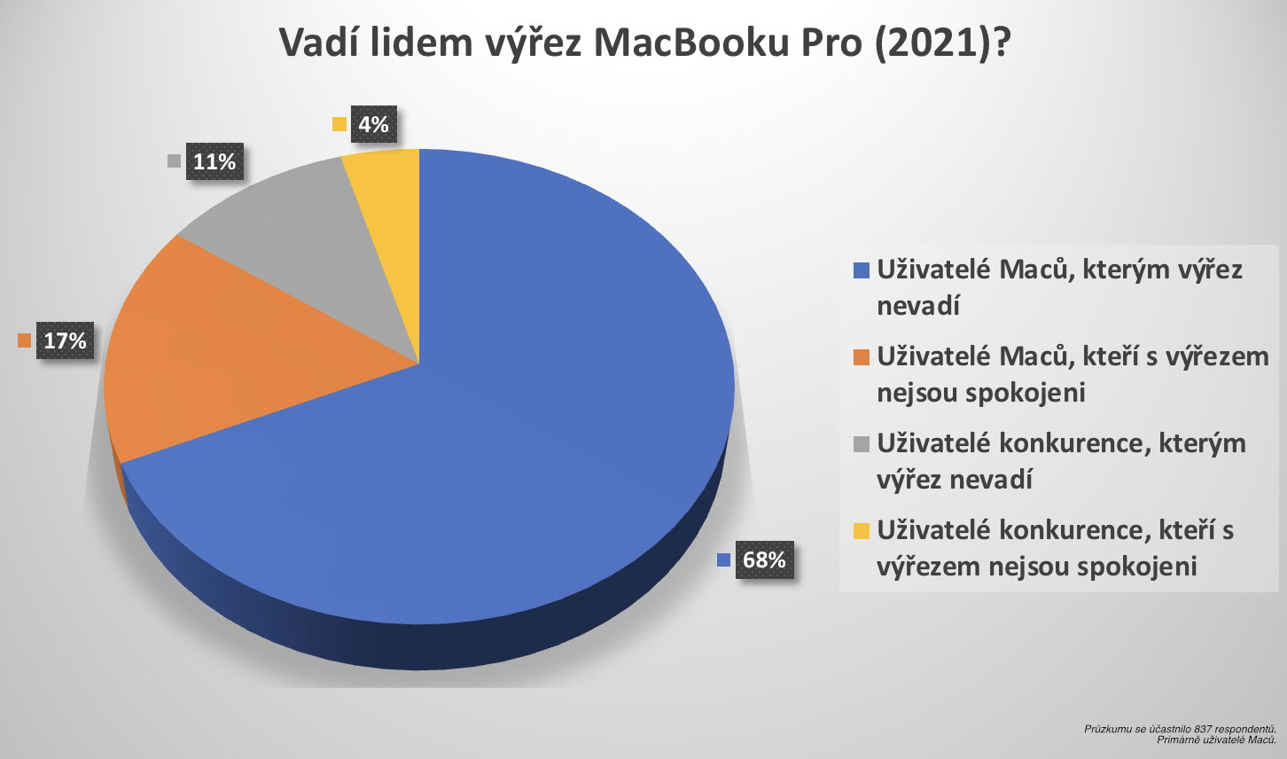 Když pak dostupná data dáme dohromady a u respondentů pomineme, zdali používají Mac či nikoliv, dostane se nám konečných výsledků a odpovědi na naši otázku, zdali lidem skutečně vadí horní výřez, nebo jestli jim jeho přítomnost nevadí. Jak ostatně můžete níže vidět, prakticky můžeme říct, že pouze 1 člověk z pěti s notchem není spokojen, zatímco zbytku je to víceméně jedno. Na druhou stranu je nutné zohlednit vzorek samotných respondentů. Naprosto drtivá většina z nich jsou uživatelé jablečných počítačů (85 % lidí, kteří se průzkumu zúčastnili), což může výsledná data svým způsobem zkreslovat. Na druhou stranu i respondenti z řad uživatelů konkurence drtivá většina odpověděla způsobem, že jim výřez zkrátka nevadí.